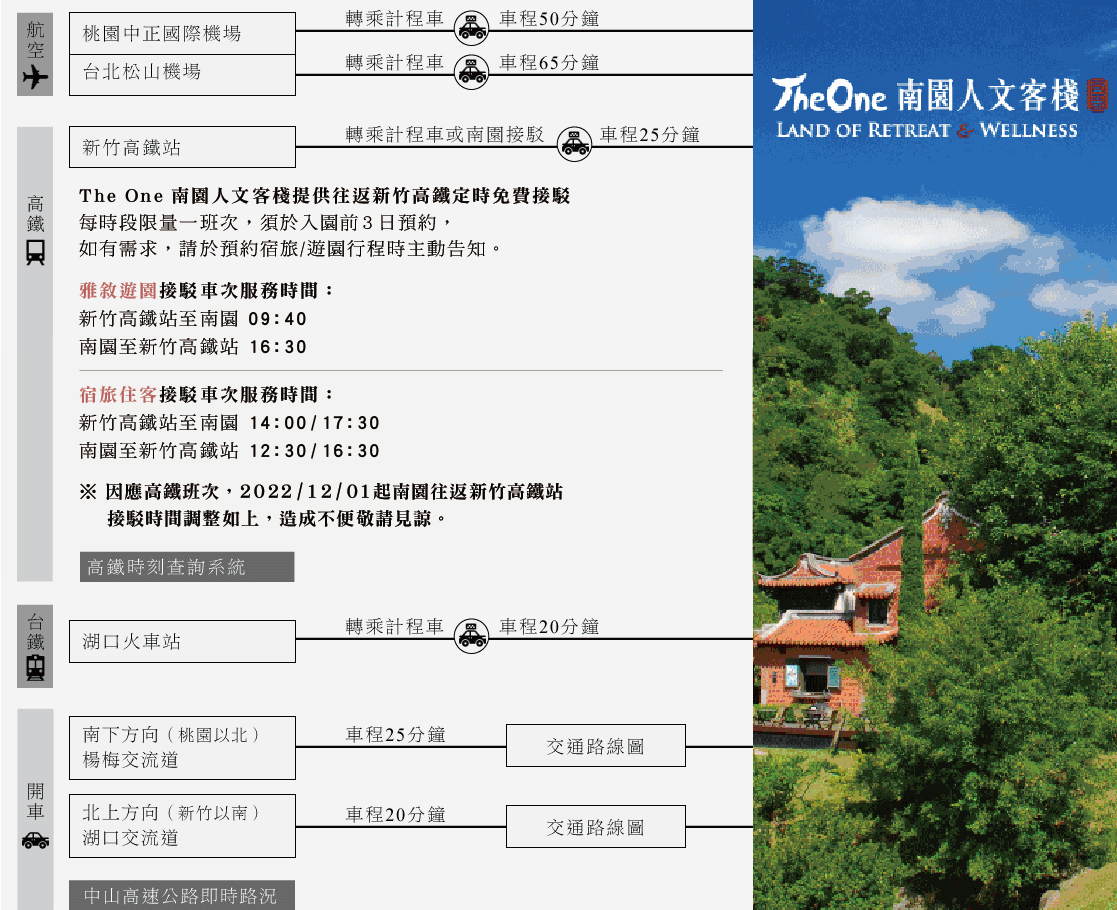 南園位於新埔、湖口、楊梅三地交界處, 地址:新竹縣新埔鎮九芎湖32號(請循台一線省道55.6K處轉彎入園) GPS定位點:E121°6'17.0",N24°52'4.0" 如需協助,請撥打 03-589-0011 The One南園祝您行車平安,遊園愉快 交通方式如下: